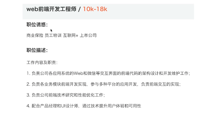 - 薪资范围(参考最小值即可,如 15k-20k 那就是 15k)和福利待遇