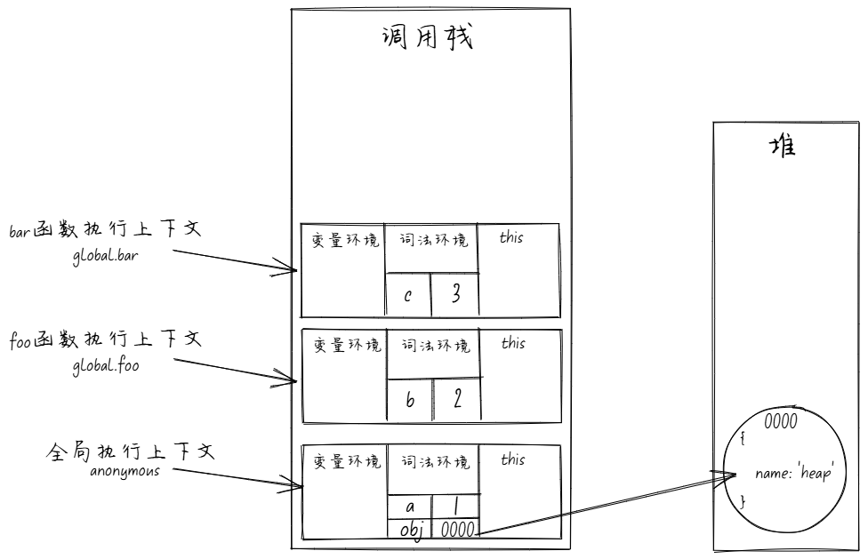 - 当 bar 函数执行完毕后,它的执行上下文会被弹出调用栈,然后 foo 函数的执行上下文也会被弹出调用栈,最后全局执行上下文也会被弹出调用栈。