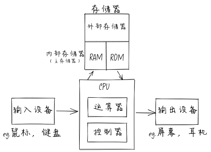 - 存储器: 计算机的记忆装置,主要存放数据和程序。分为内部存储器(内存/主存储器)和外部存储器(硬盘,光盘,U盘等)