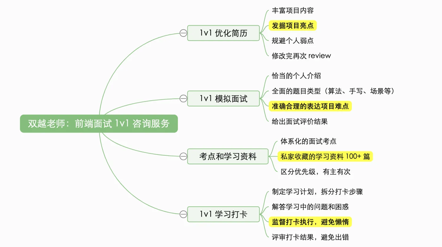再后来咨询的人多了,我发现大家除了简历优化之外,还有很多其他面试相关的问题。于是我就根据个人的工作、授课、咨询的经验,制定了一个系统全面的面试准备解决方案。可以帮大家快速全面的准备面试。